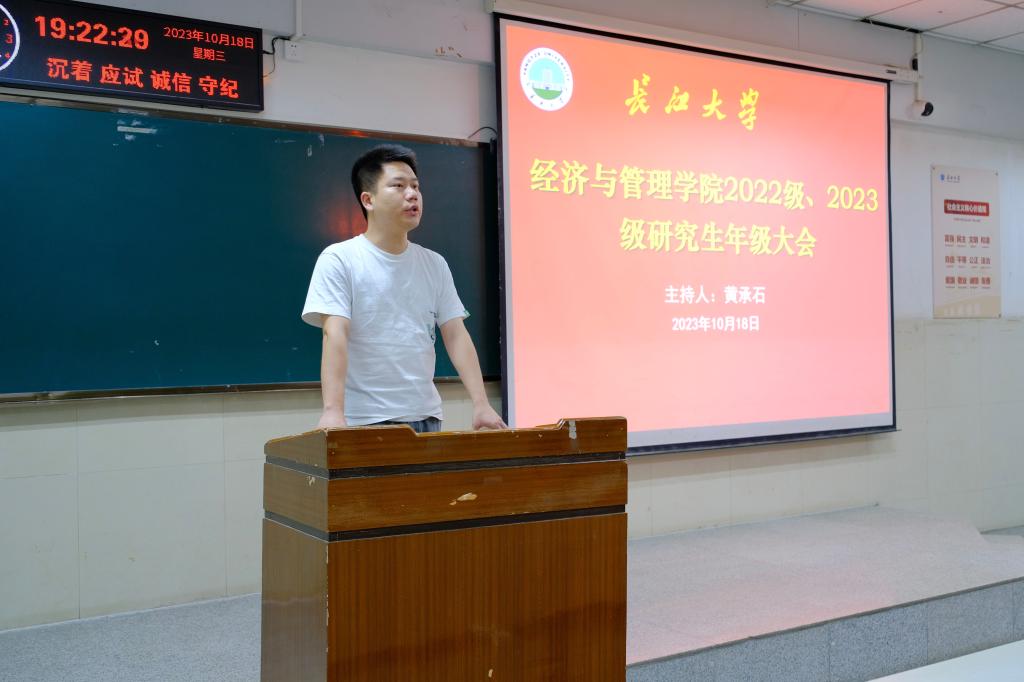(通讯员:张悦/文 何小艳/摄)为给予同学们学习生活以及未来规划多方面的建议,提出相应的要求,2023年10月18日19:20,伟德bv19462022、2023级研究生年级大会在12教104教授召开,全体2022级、2023级研究生参会,会议由辅导员黄承石老师主持。