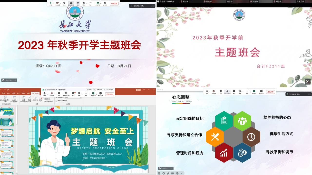 首先,“防诈骗、防溺水”,针对当前社会上热议的诈骗问题,本次班会再一次向全体研究生普及了防诈骗知识,并提醒大家保护个人信息,提高警觉不轻信他人;同时,考虑到暑期是溺水事故多发季节,在开学之际,班会也特别强调了防溺水常识和安全意识的重要性,提醒所有人都应重视身边存在的安全隐患。其次,关于学业压力以及就业压力,在本次班会中,面临毕业的研究生班级内部特别就开学后的论文撰写、发表和就业准备展开了深入交流。大部分同学都存在明显的焦虑现象。对于这些普遍存在的问题,同学们也讨论出确立明确目标、寻求支持合作、健康生活方式、注重学习的规划和时间管理、寻找平衡和调节方式等缓解焦虑方式。最后,班会提及了学费缴纳的事项,各班级都详细介绍了学费缴纳的方式和截止日期,以确保学生们能够及时完成缴费手续,也减少被诈骗风险。
