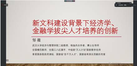 本次会议分两阶段进行。会议第一阶段,邹薇教授以“新文科建设背景下经济学、金融学拔尖人才培养的创新”为题作了精彩讲座。邹教授首先指出新文科建设是大势所趋;然后介绍了卓越拔尖计划从1.0到2.0的发展历程,分析了新时代“卓越拔尖计划2.0”的新要求以及新文科建设对经济学、金融学专业人才培养的新挑战;最后针对新文科建设背景下经济学、金融学人才培养创新问题,介绍了个人心得体会,认为要做好人才培养创新,必须要处理好基础性与前沿线、国际化与本土化、系统性与宽口径、经济学与金融学、传统授课与实践教学等五种关系,向内打通文史哲艺、涵育文化灵魂,向外融合自然科学、吸纳理性方法。