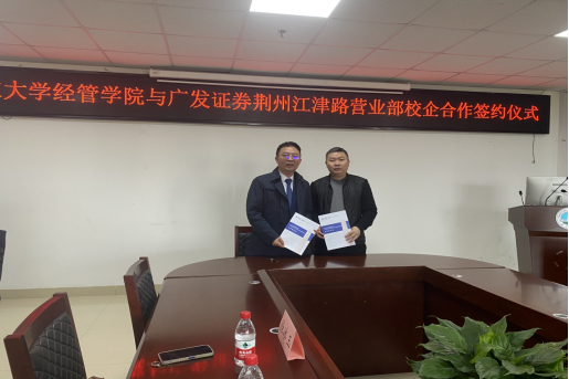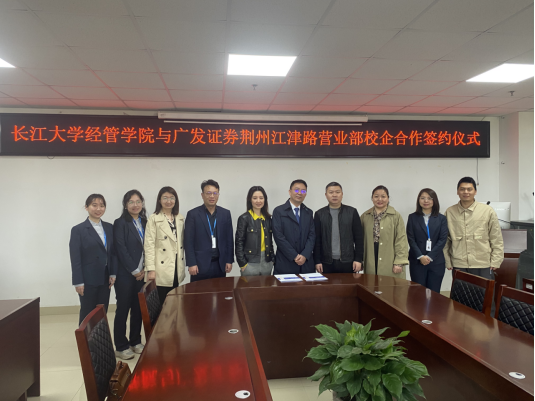 (通讯员 郭俊)3月31日上午,伟德bv1946与广发证券荆州江津路营业部校企合作签约仪式在文科楼505顺利举行。我院院长徐辉、学院党委副书记王中梅、就业专干郭俊、广发证券荆州江津路营业部总经理胡波、人力资源部李怒、办公室主任高嵩以及公司代表徐冰玉、张婕、陈艳娇、闵娇出席了本次仪式。