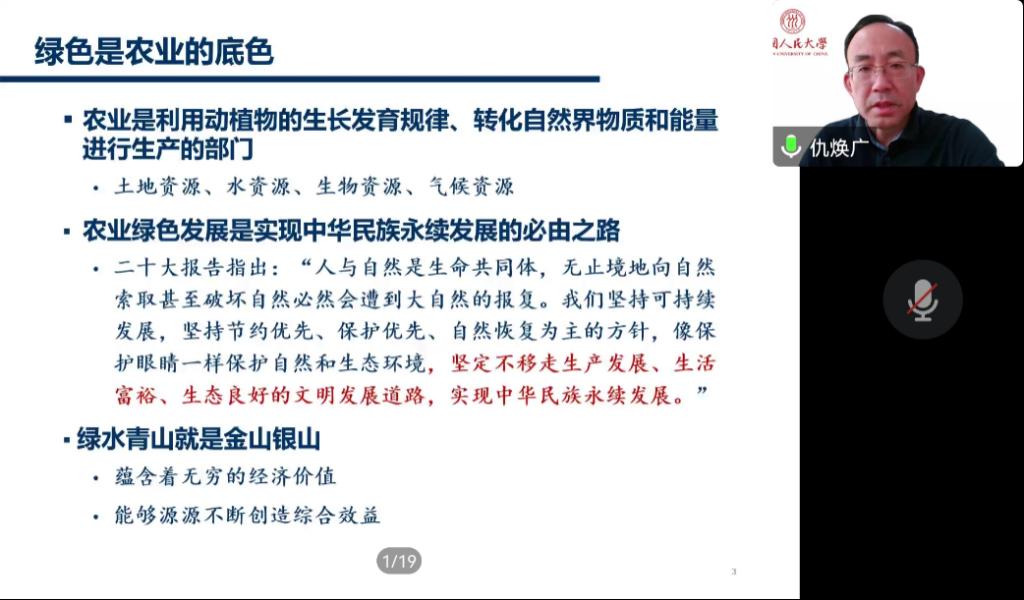 徐辉代表经管学院对仇焕广教授表示感谢,并邀请仇教授在疫情结束后亲临我院指导讲学。同时激励我院师生努力学习,把握好未来研究的方向,共同促进绿色农业的发展。