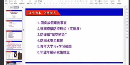 其次,会议要求全体研究生参加星空班会“防电诈学习”,帮助同学们熟悉诈骗套路,从而提高防电诈骗能力。同时,也进行了防溺水安全教育,提醒同学们江边游玩需多加注意。最后,老师们提醒大家重视每周青年大学习以及学习强国,朱老师也对毕业年级研究生的就业进行了简要说明。