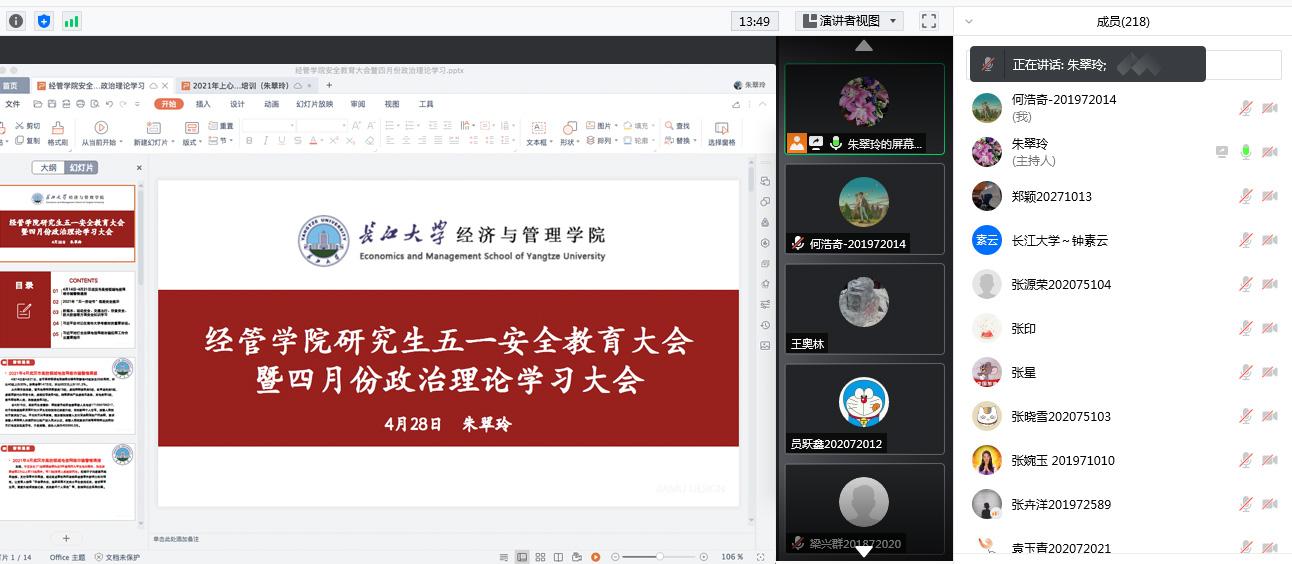 (通讯员 王雪婷)4月28日晚,我院研究生线上组织开展了研究生五一安全教育大会暨四月份政治理论学习大会,学院党委副书记王中梅、研究生辅导员朱翠玲及全体研究生参加会议。