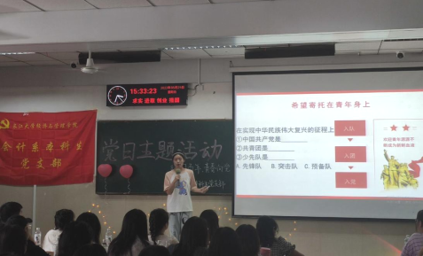 (通讯员:陈娟、高仁东)为传承“五四”精神,学习贯彻习近平总书记在庆祝中国共产主义青年团成立100周年大会上的讲话精神,培养青年生逢盛世,担当作为的情怀,伟德bv1946会计系本科生党支部在5月29日于12教103开展了“建团百年,青春向党”主题党日活动,参与此次活动的有支部学生党员和预备党员。