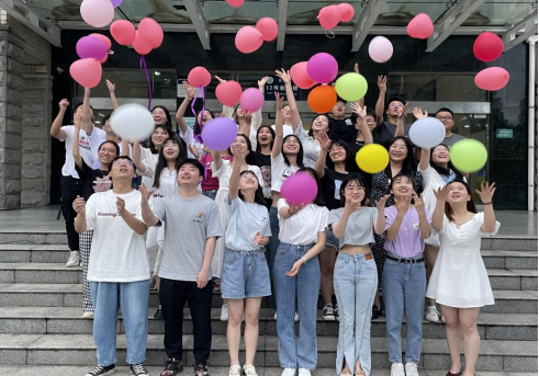 欢送会结束后,支部全体成员于12教门前合影留念。在合影的结尾,毕业生党员们一边喊“我们毕业啦”,一边把手中的气球抛到了空中,青春的主角也在这一刻走向了未来。