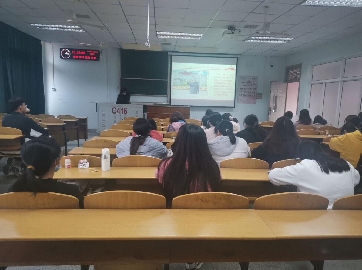 本次团会推陈出新,形式多样,主要由三个板块组成。首先是由主持人带领同学们学习中国共产党精神谱系,以精神力量为基础,以长征精神及红岩精神为重点,深入了解了中国共产党的精神谱系。为了提高同学们参与团会的积极性,在本次宣讲的过程中穿插了诗朗诵和情景剧的表演。洪亮的声音包含了真挚的情感,生动的表演表达出内心的缅怀。这些精彩表演的背后表现了同学们作为青年人希望贡献力量的强烈意愿。