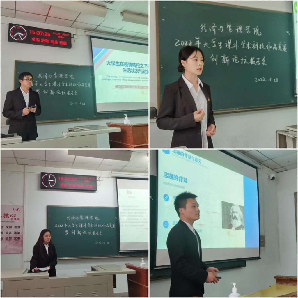 此次比赛共分为两个阶段,首先进行的是课外学术科技作品竞赛。进入决赛的7个项目团队分别选派代表上台参加答辩,全面细致地阐述了项目的背景、意义、研究方法以及当前已取得成果等。这些项目大多聚焦于当今社会的主流关注话题,如“碳排放管理员及其现实意义”、“高校劳动教育与大学生劳动观培养研究”等,亦或者是对周边发展环境、日常实际生活的观察、研究与思考,如“江汉平原农业生产托管对农户绿色生产的影响”、“长江经济带城市化与高等教育规模的耦合协调分析”、“智能快递柜在高校中的应用与推广”、“湖北大学生疫情防控之下的学习、生活状况与对策”等。同学们针对评委提出的问题均作了认真回答,并进行了有效地交流探讨,明确了项目还存在的不足之处及今后改进的方向。
