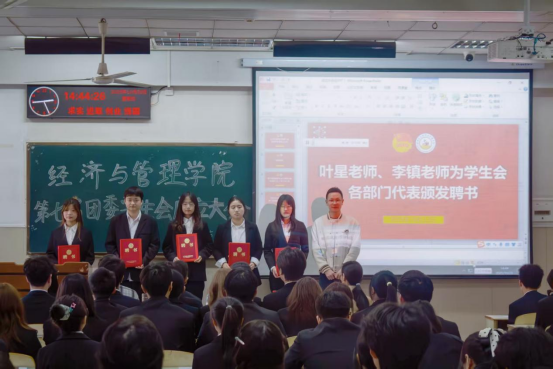 大会在庄严的国歌声中拉开帷幕。第六届团委学生会主席团代表张丽作年度工作汇报,系统性总结了过去一年的工作经验与成果。随后,团委书记杨雪老师宣读第七届团委学生会聘任文件,叶星老师与李镇老师共同为各部门学生代表颁发聘书。