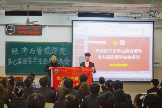 在庄严的授旗仪式中,学院党委副书记平先锋将第七届团委学生会会旗授予新任主席薛诗宸,标志着新一届学生会开启全新征程。薛诗宸在任职展望中表示,新一届学生会将在传承历届优良作风的基础上,重点围绕思想引领、组织改革、双创赋能与服务同学四个方面开展工作,持续筑牢学院与广大同学之间的桥梁。学生会成员代表赵熙在发言中表达了恪尽职守、不负期望的决心。