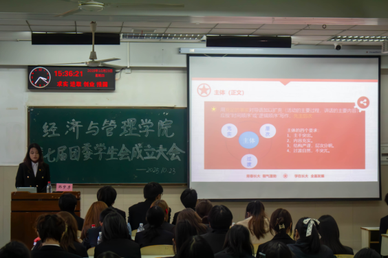 (通讯员 欧阳佩文/文 冉聪怿/摄)为持续推动学院学生组织发展,激发学生干部的责任意识与担当精神,10月23日14时30分,伟德bv1946第七届团委学生会成立大会在东校区12教101室正式举行。学院党委副书记平先锋、学工办主任叶星、团委书记杨雪、2023级辅导员李镇出席大会,伟德国际victor1946艺术团主席韩梦彦、第六届团委学生会主席团代表张丽及第七届团委学生会全体成员参会。