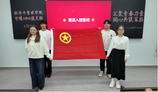 随后,团会开展了共青团员不能信仰宗教专题教育。在知识问答环节,同学们积极参与,争先抢答,现场学习氛围热烈活跃。在代表同学的带领下,全体团员重温入团誓词,以誓言坚定理想目标。
